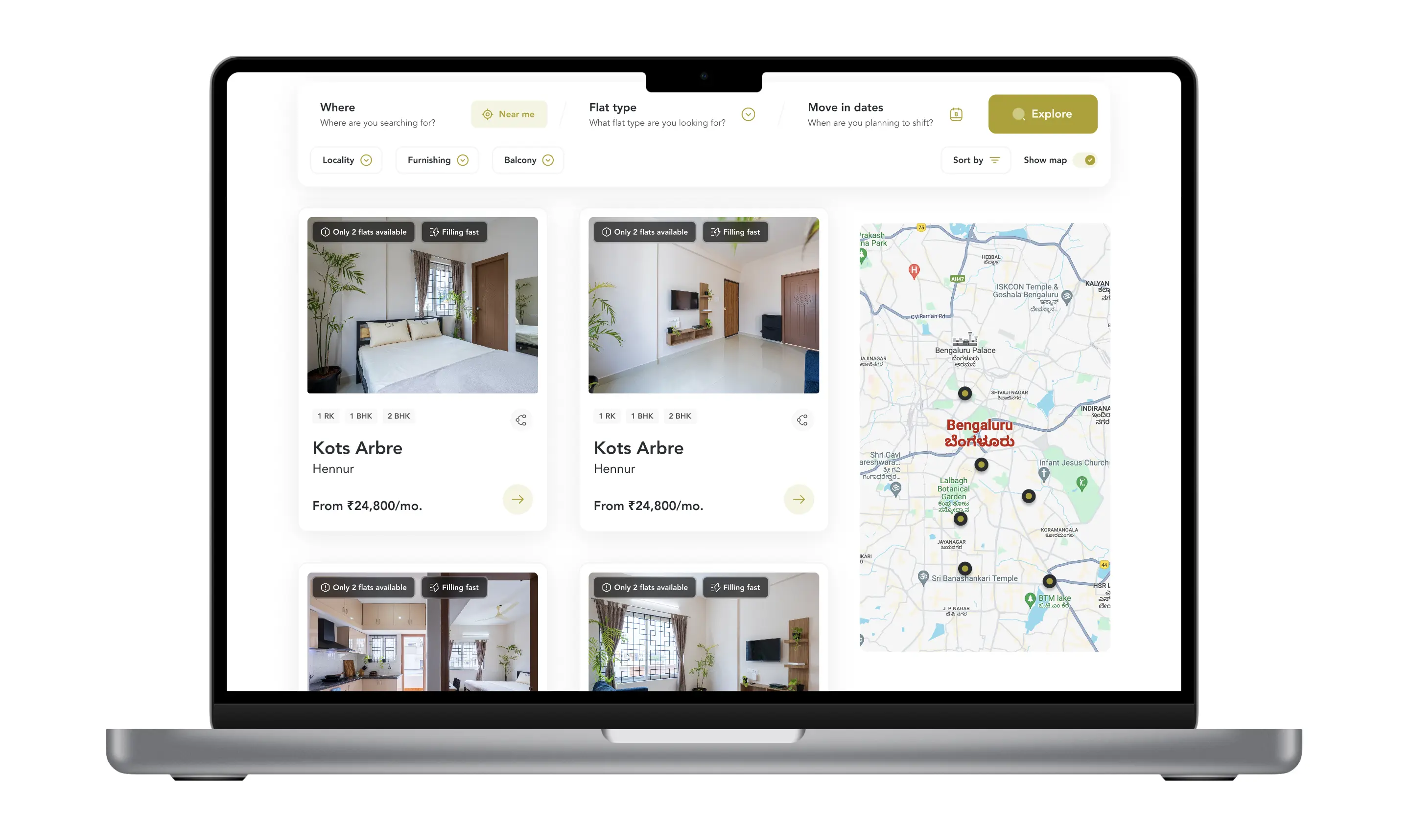 Users can now easily filter apartments based on location, flat size, move-in dates, and other key preferences, helping them find options that best suit their needs. Additionally, they can search based on their current location or office address, making it more convenient to discover nearby rentals. To enhance the experience further, a map view has been added, allowing users to visually explore properties, see their exact locations, and make more informed decisions.